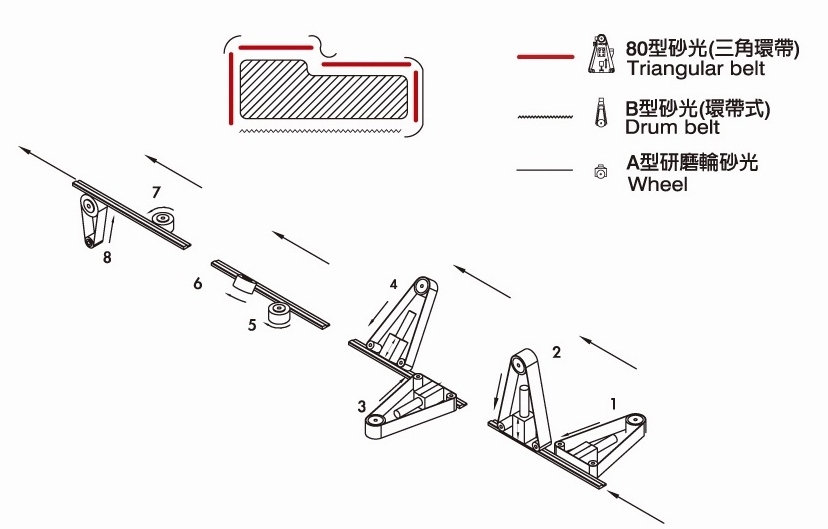 此重型C型刨光座機環帶式傳動,驅動馬力為7.5HP(10HP)且主軸角度亦可微調直角度。 - 80型三角環式砂光座(右下兩式):